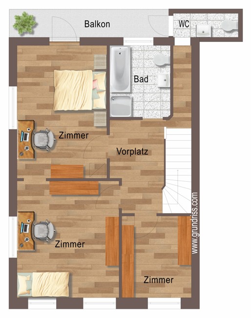 Das Obergeschoss (ebenfalls ca. 61 m²) bietet drei vielseitig nutzbare Zimmer, die sich perfekt als Schlaf-, Kinder- oder Arbeitszimmer gestalten lassen. Ein Tageslichtbad mit Badewanne und Dusche, ein separates WC sowie ein sonniger Balkon schaffen zusätzlichen Komfort und Freiraum.