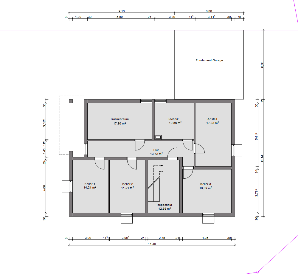 Im Untergeschoss befinden sich vier Kellerräume, ein Trockenraum sowie der Technikraum. Das Untergeschoss wurde modernisiert und dient als funktionaler Nutz- und Lagerbereich.